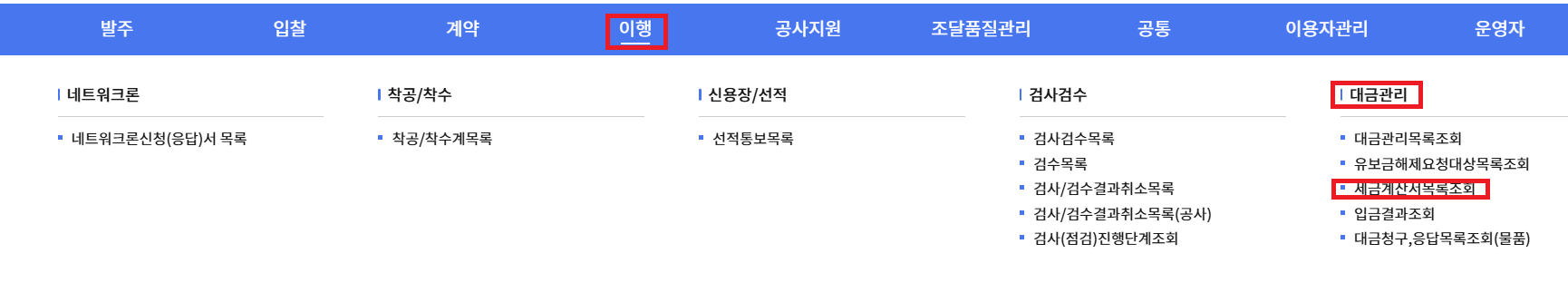 나라장터 첫페이지에서 이행>대금관리>세금계산서목록조회