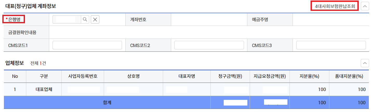 -대표(청구)업체 계좌정보 작성 및 4대사회보험완납조회 진행 후 저장> 송신