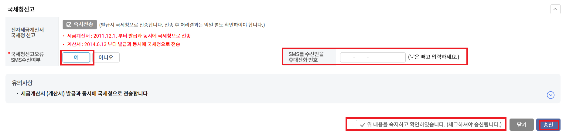 -아래 내용 숙지 체크 > 송신.