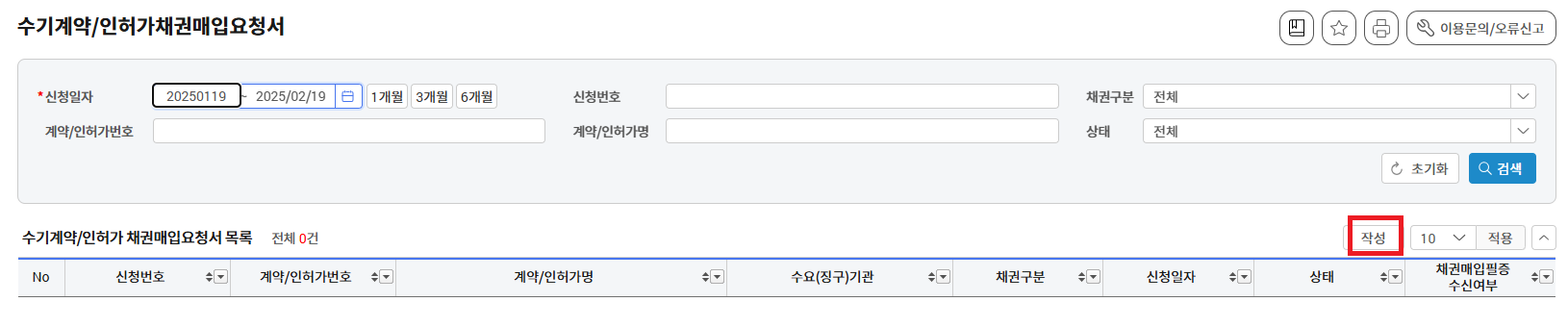 일단, 수기계약/인허가 채권매입요청서 목록으로 가줍니다.
