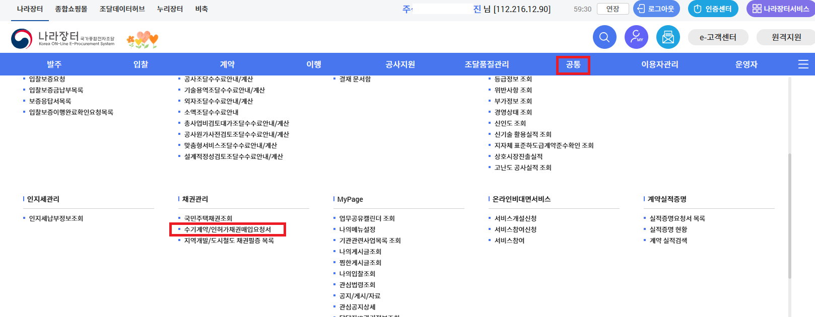 1. 나라장터 로그인 > 공통 > 수기계약/인허가채권매립요청서 클릭.