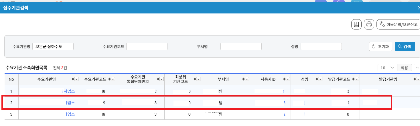 -접수기관명을 검색하면 아래와 같이 한 수요기관에 여러명의 담당자가 확인됩니다, 해당되는 담당자를 선택해주시면됩니다.(확인이 어려우시면 수요기관쪽에 문의 후 진행해주세요)
