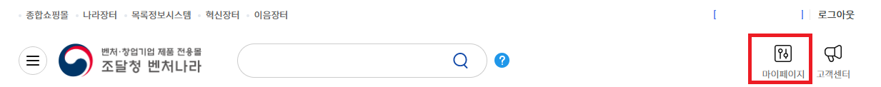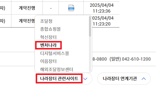 1. 나라장터 홈페이지 오른쪽 하단에 "나라장터관련사이트" > 벤처나라 입장
