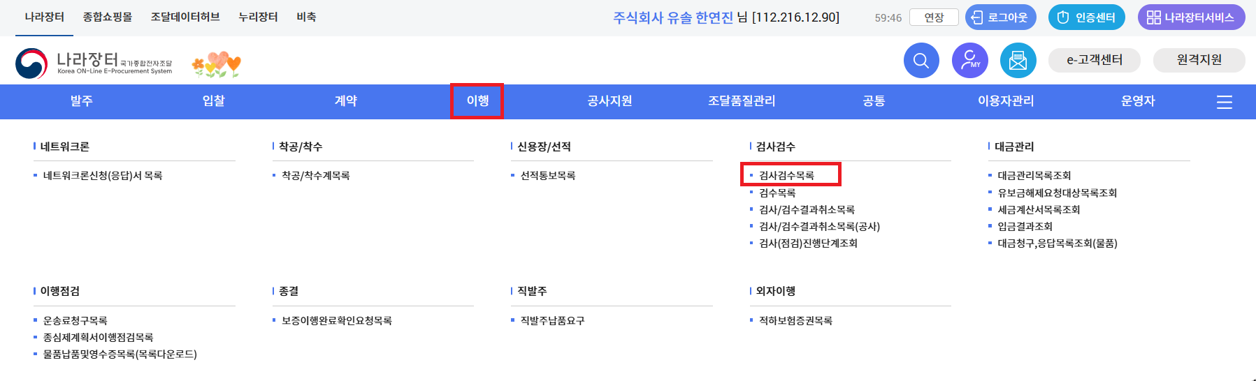 첫번째,나라장터 > 이행 > 검사검수 > 검사검수목록 으로 들어가시면 검사검수요청했던 문서를 볼 수있습니다.