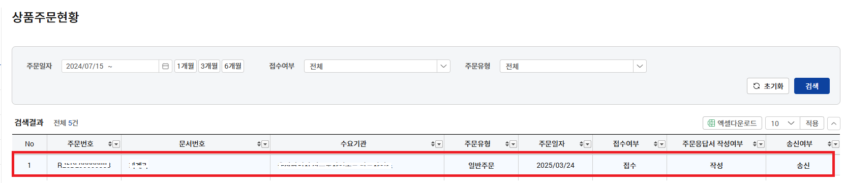 3. 상품주문현황이 보여지는대요 "접수여부" 전체로 변경하여 검색해주시면 주문서 접수 목록이 표기가됩니다.