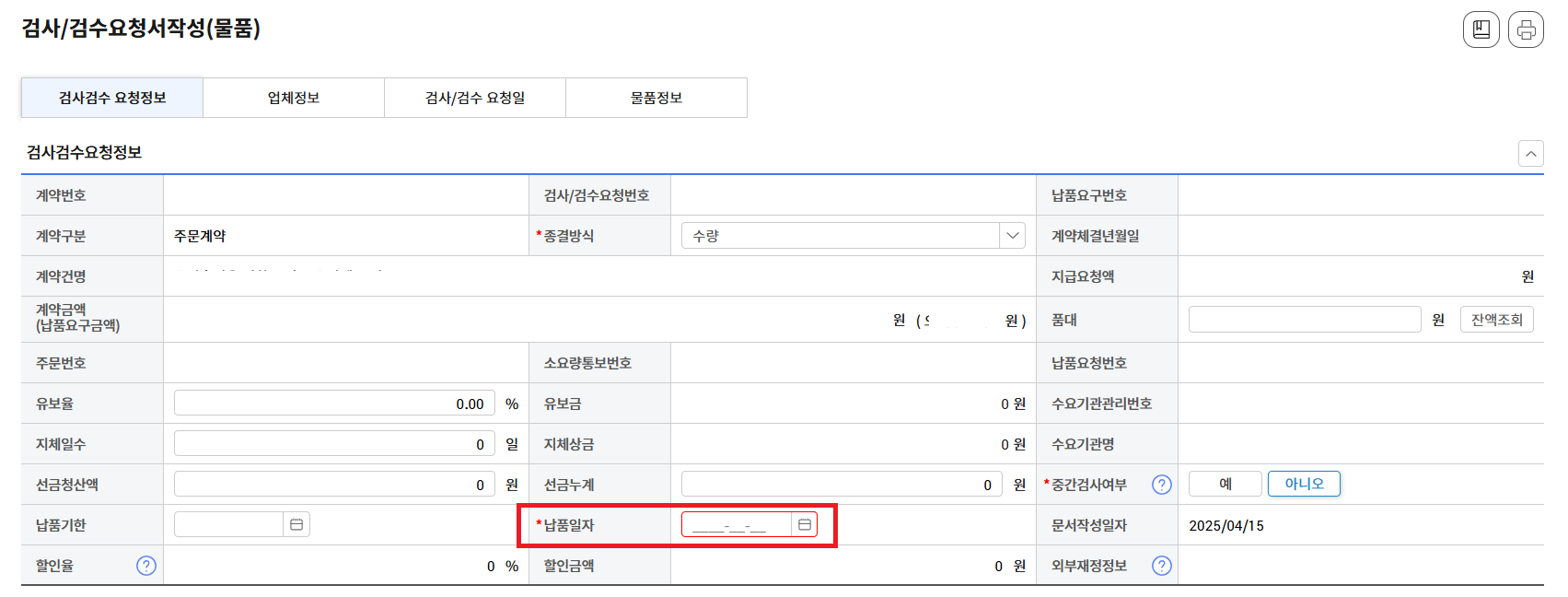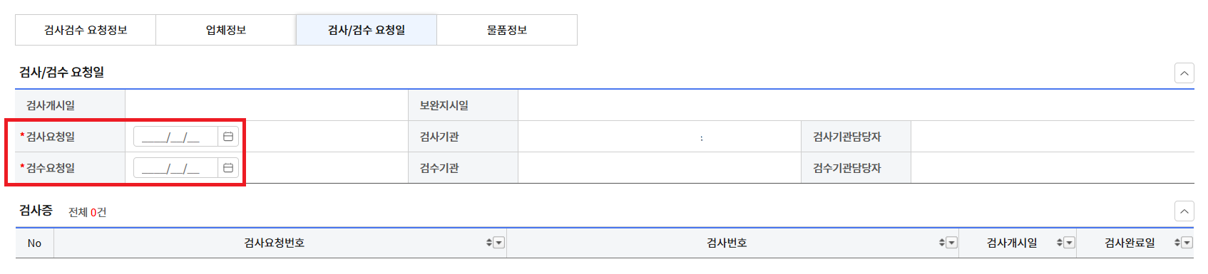-첫번째로, 검사/검수요청일로 들어가 "검사검수 요청일" 지정