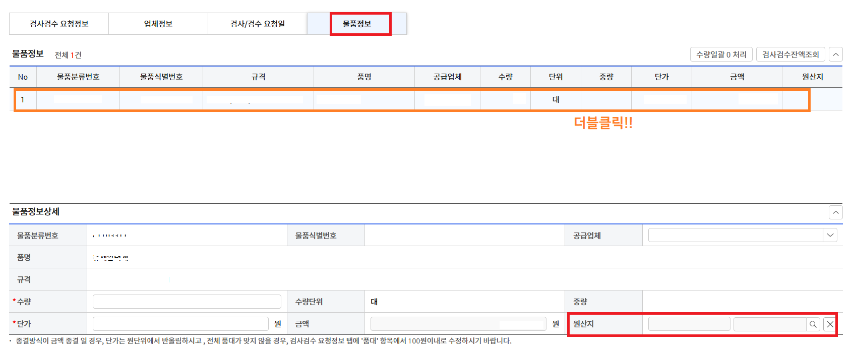 -두번째로, 물품정보로 들어가 해당 물품을 더블클릭하면 아래쪽 물품정보상세에 자동으로 기재가 됩니다.