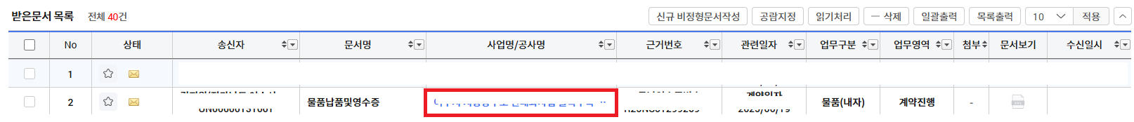 2. 해당물품납품및 영수증 "사업명/공사명"클릭.