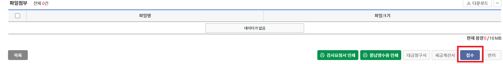 5. 접수를 클릭하게되면 "대금청구서"와"세금계산서"버튼이 활성화 됩니다.>첫번째로 "세금계산서"클릭.