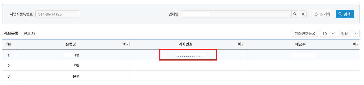대표(청구)업체 게좌정보는 조달청에 등록되어있는 당사의 계좌번호가 조회됩니다.