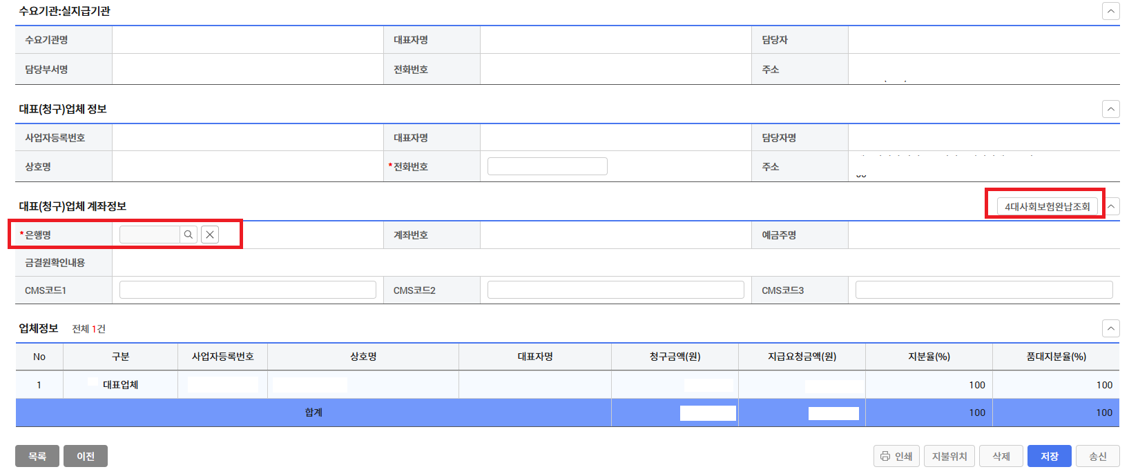 업체정보에선 "대표(청구)업체 게좌정보"와"사대보험완납조회"를 필수로진행해주시면 됩니다.