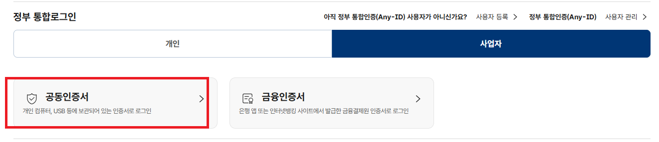 2. 로그인 : 저는 법인인증서로 로그인시도했습니다.