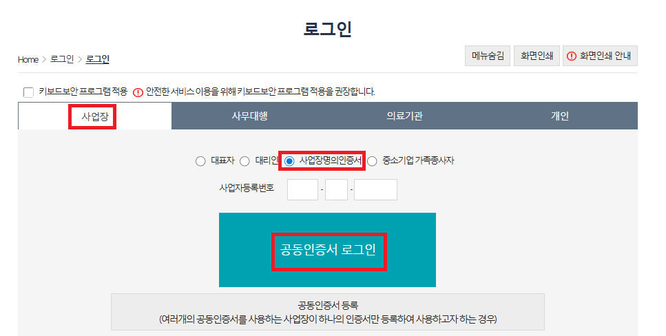 3. 사업장 > 사업장명의인증서 > 사업자등록번호 기재 > 공동인증서 로그인 클릭.