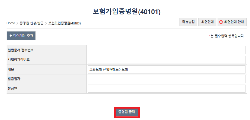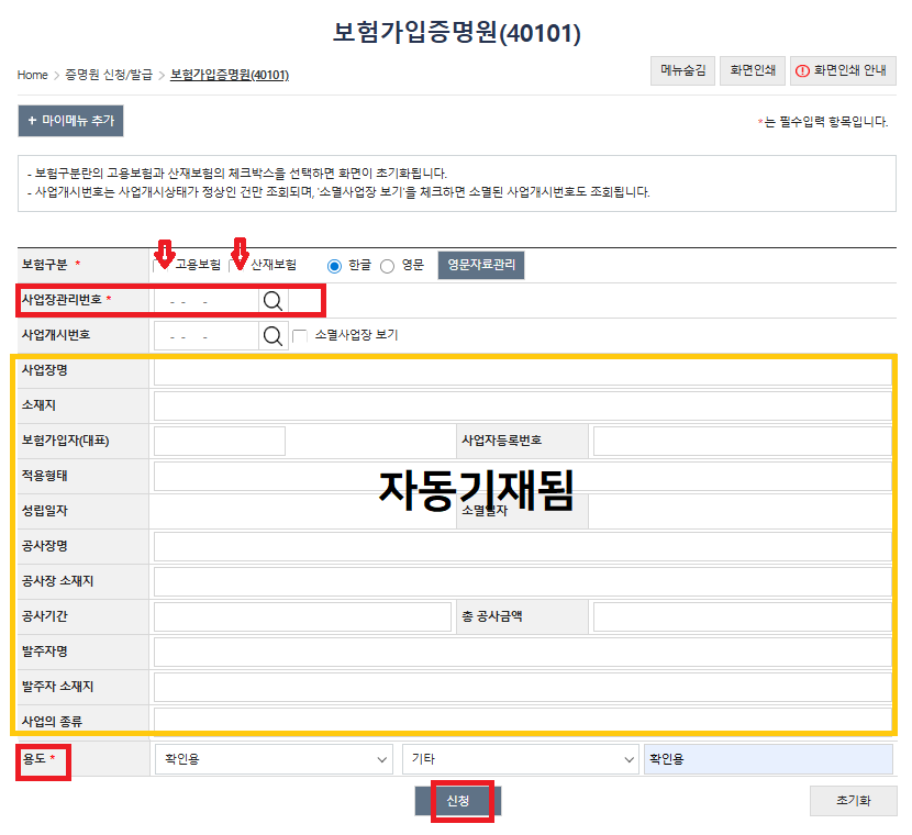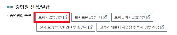 -보험구분 : 고용,산재 필요한 가입증명원 체크.