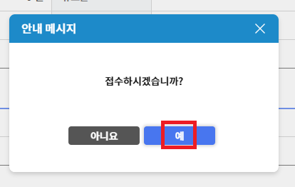 아래와 같이 송신되었습니다. 안내메시지가 뜨면 요청서 전송이 완료된겁니다.