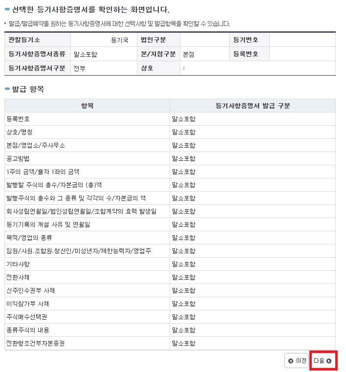 5. 등기사항유형선택> 다음> 발급할 등기사항증명서 항목 선택> 다음