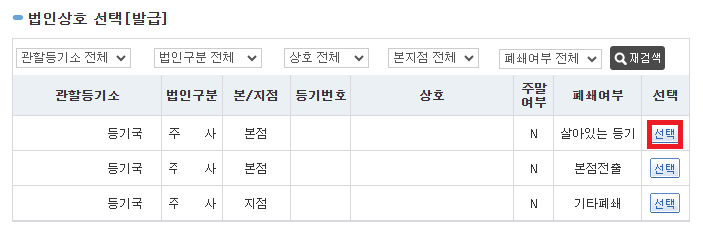 4. 발급가능한 법인상호가 아래쪽에 표기됩니다. 해당되는 등기 선택