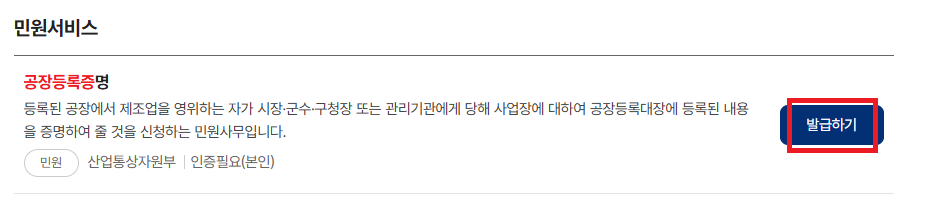 4. 공장등록증명 "발급하기"버튼 클릭