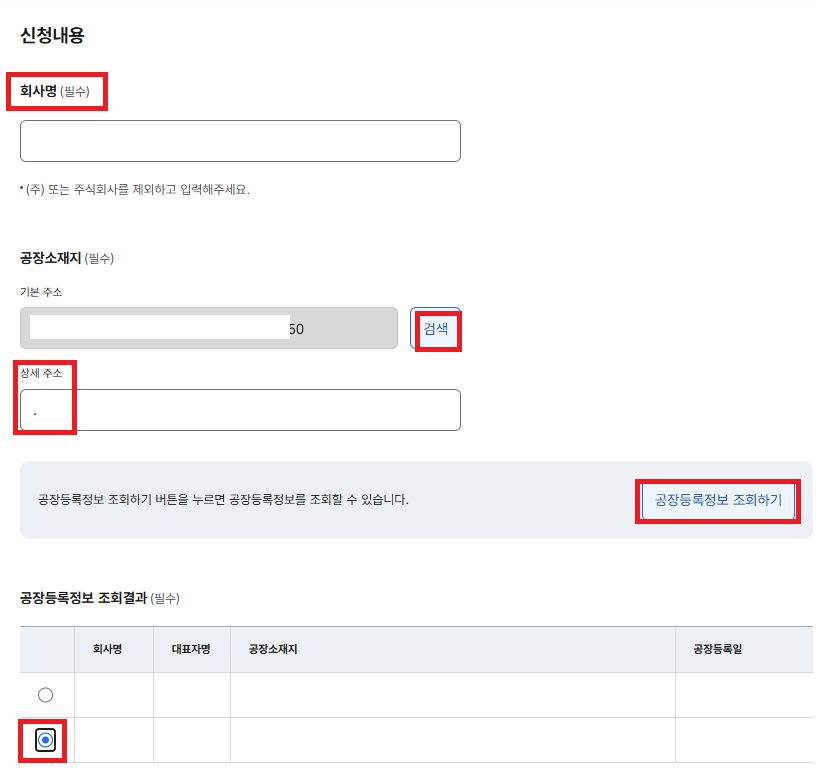*회사명(필수),공장소재지(필수) : 상세주소에 적을내용이 없더라고 "." 하나는 기재되어야합니다.
